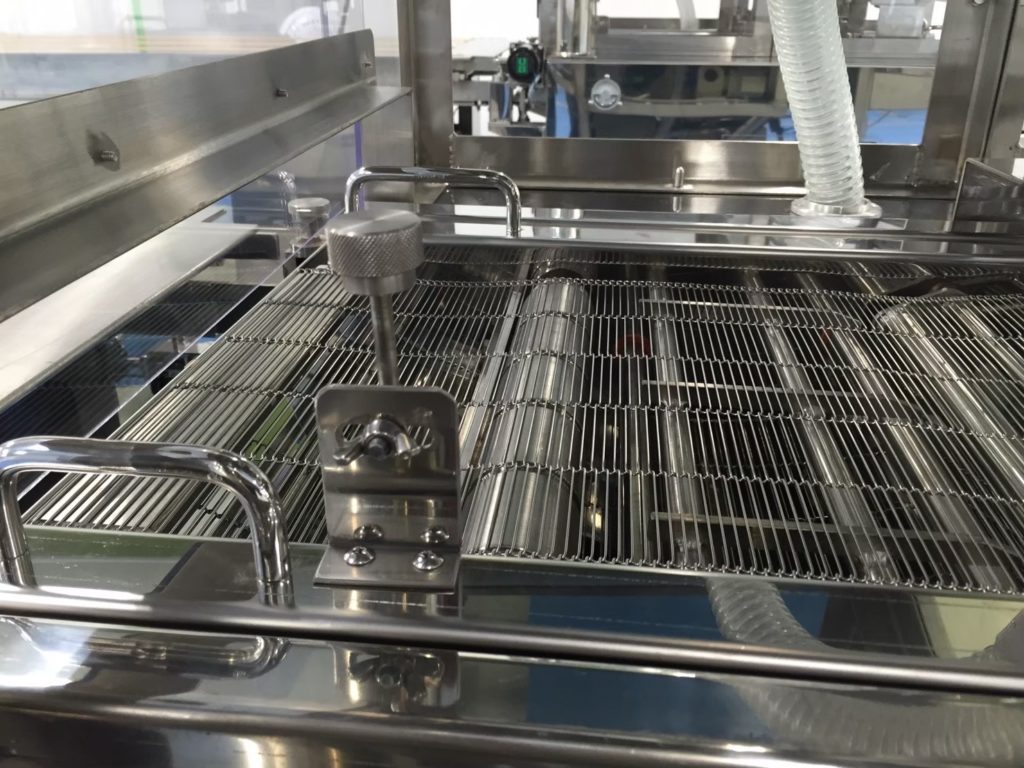 長時間の運転を続けているとコンベアー上でチョコレートが進行方向に引っ張っていき軸に絡みつき固まってくる場合があります。(※製品温度によります)