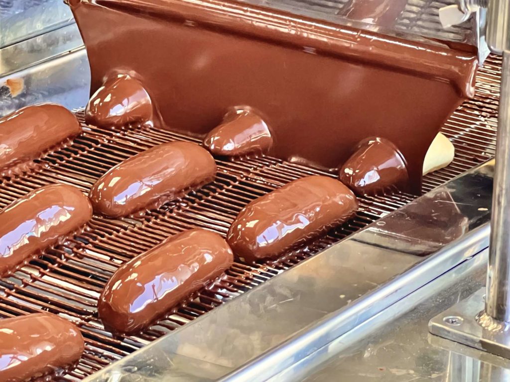 スピードを速めれば生産量は増えますが、チョコの掛かり方が薄くなったり、製品が崩れやすくなるリスクがあります。